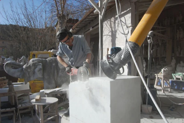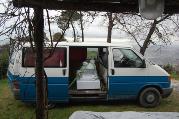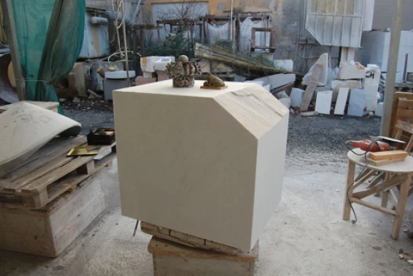 In der Werkstatt von Christian Lange in Pietrasanta fanden sich sowohl Marmor, wie auch ein kleiner Arbeitsplatz.