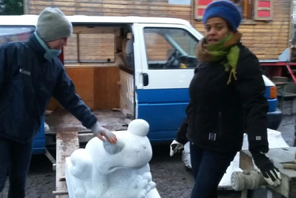 Von Tag zu Tag wurde der Frosch leichter und am Ende wog er „nur“ noch ca. 800 Kg. Mit dem Gewicht ging es über die Alpen zurück nach Berlin.