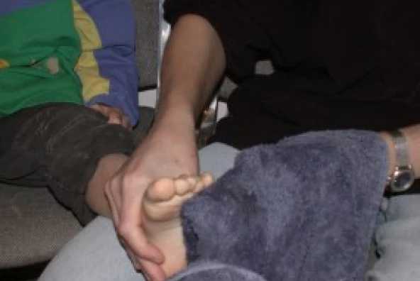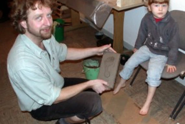 Im November und Dezember 2003 in Eckernförde: Täglich kommen bis zu 60 Kinder in den Galerieraum in der Ottestraße 1 begleitet von ihren Eltern oder den Erzieherinnen; dort sind einige bereits gebrannte Ziegelsteine mit Fußabdrücken ausgestellt. Bevor es losgeht, machen wir meistens etwas Musik…