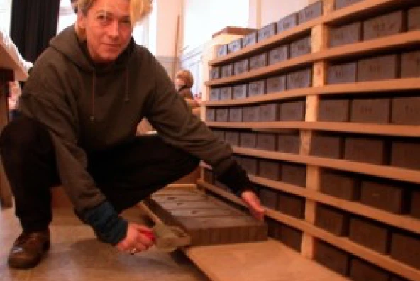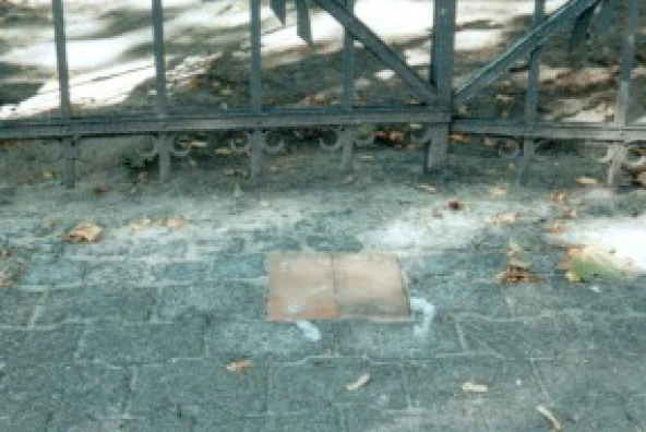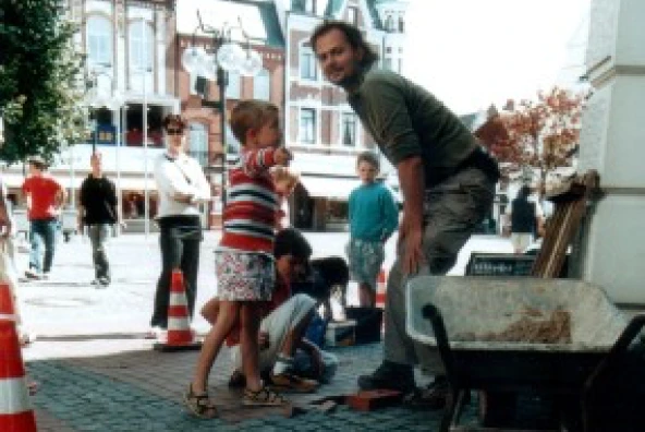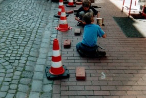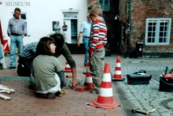 Ab dem Sommer 2004 werden die Ziegelsteine in die Pflasterung der Stadt eingearbeitet. Für jeden Ziegelstein müssen bis zu fünf andere Steine herausgenommen und abgesägt werden. Fridjof und Johann helfen dabei.